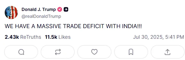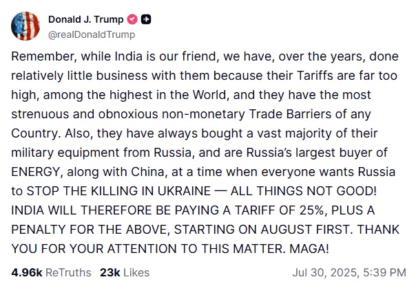 हमेशा की तरह अपने अप्रत्याशित अंदाज में, डोनाल्ड ट्रंप ने यह बड़ी घोषणा अपने सोशल मीडिया प्लेटफॉर्म 'ट्रुथ सोशल' पर की। अपने पोस्ट में उन्होंने एक तरफ तो भारत को "मित्र" देश बताया, लेकिन दूसरी तरफ भारत की व्यापार नीतियों पर तीखा हमला भी किया। उन्होंने लिखा, "भारत हमारा मित्र है, लेकिन उनके द्वारा लगाए गए गैर-मौद्रिक व्यापारिक अवरोध (non-monetary trade barriers) अब असहनीय हो गए हैं।" ट्रंप ने यह भी दावा किया कि भारत के टैरिफ दुनिया में सबसे ऊंचे हैं और अब अमेरिका इसे और बर्दाश्त नहीं करेगा।