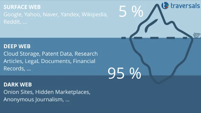इंटरनेट को इंगित करने के लिए इसकी तुलना एक विशाल हिमखंड (हिमखंड) से की जा सकती है। जो भाग पानी के ऊपर दिखाई देता है, वह Surface Web है - यहां Google, Facebook, YouTube जैसी वेबसाइटें हैं जिनका उपयोग हम प्रतिदिन करते हैं। यह पूरे इंटरनेट का 4-5% हिस्सा है।