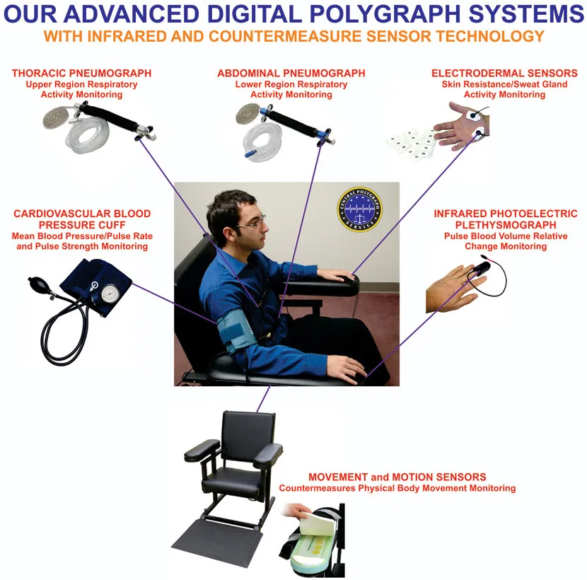 पॉलीग्राफ मशीन व्यक्ति के शरीर पर 4-6 सेंसर लगाकर निम्नलिखित शारीरिक संकेतकों को मापती है: