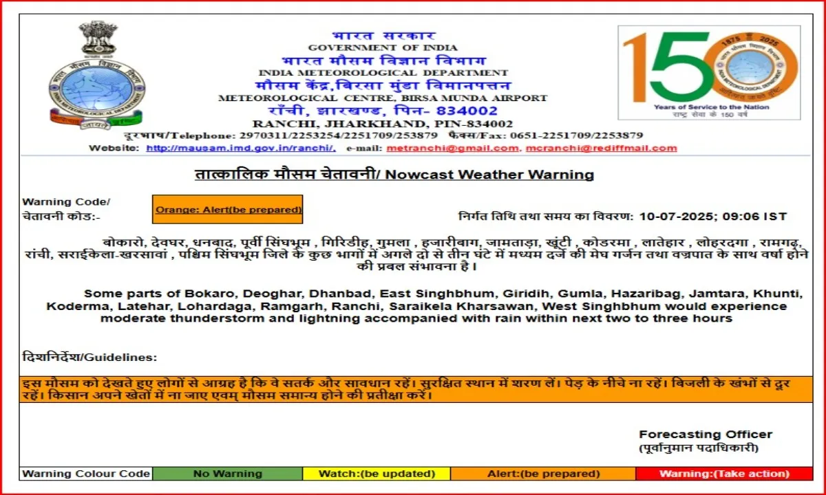 झारखण्ड में 14 जुलाई तक भारी बारिश की संभावना, मौसम विभाग ने जारी किया अलर्ट